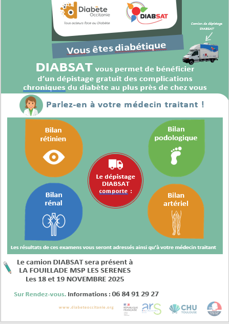 La MSP les Serènes propose un dépistage gratuit des complications chroniques du diabète : bilan rétinien, bilan rénal, bilan artériel, bilan podologique