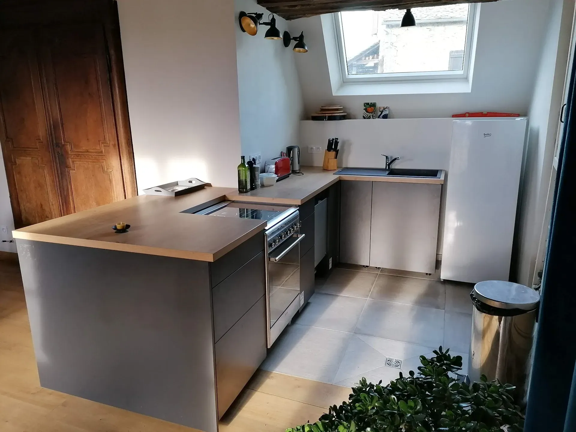 Vous entrez dans une grande pièce agréable de 50m2 avec salon et table à manger. Une nouvelle cuisine et poêle à bois se sont installés. Cette pièce possède 2 armoires anciennes originales. L’escalier mène à 2 chambres, une salle de bains avec douche et baignoire et des toilettes séparées.