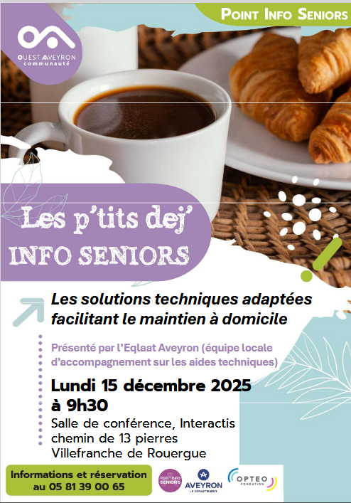 Pour le dernier « P’tit Dèj’ Info Seniors » de l’année, le Point Info Seniors vous invite Lundi 15 décembre à 9h30, à la salle de conférence de Ouest Aveyron Communauté, à Villefranche de Rouergue.